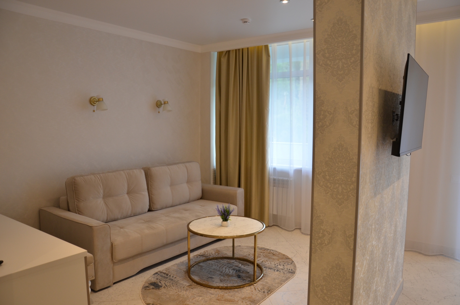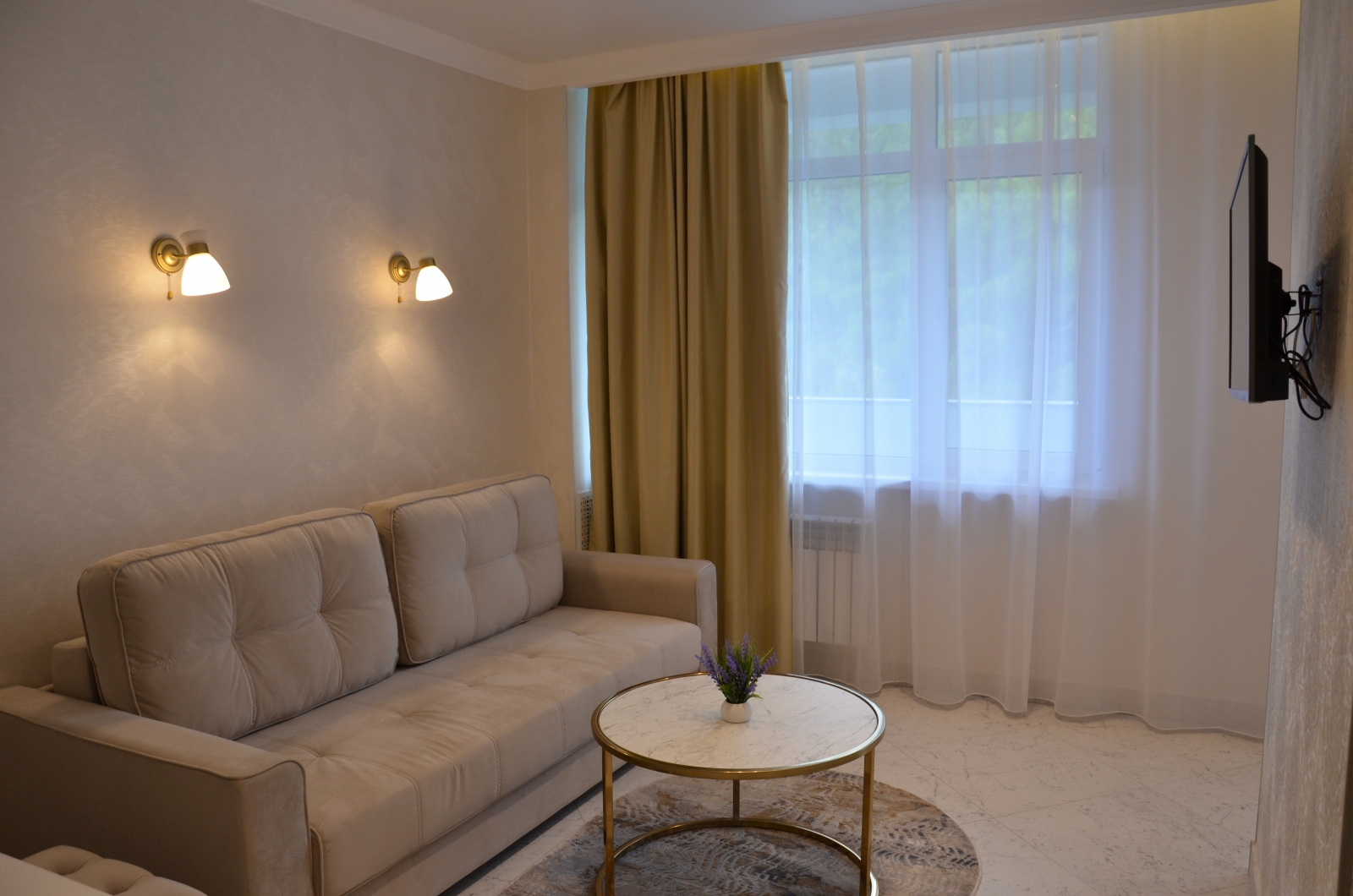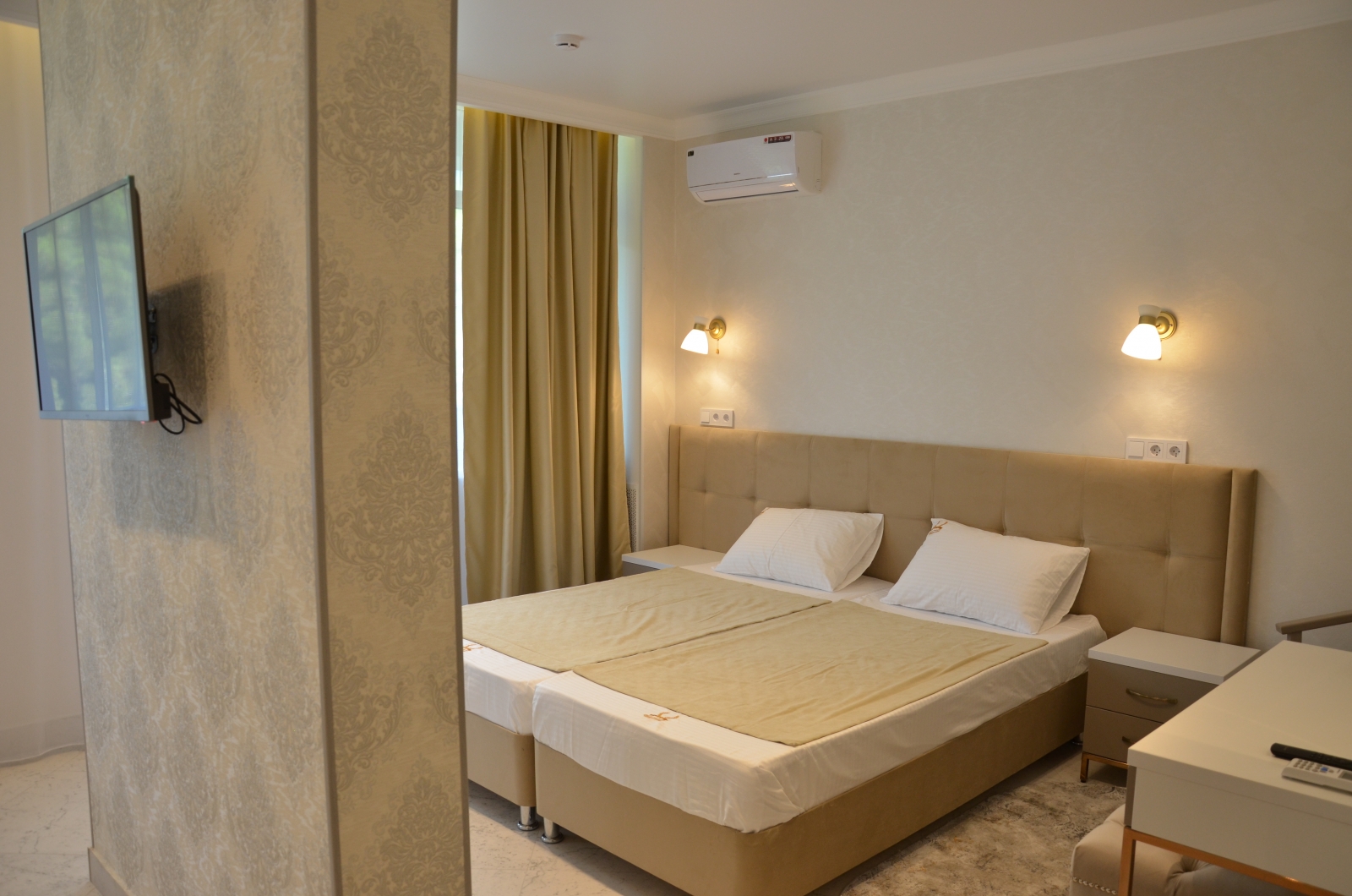 Площадь номера - 36,6-39,4 кв.м. 2 осн. места. 2 доп. места. Балкон. Мебель: вешалка, диван, зеркало, кровати односпальные, прикроватные тумбочки, стол, стулья, шкаф. Оборудование: кондиционер, телевизор, холодильник, электрочайник. Санузел: с душем, туалетные принадлежности, фен. Сервис: Wi-Fi бесплатно, смена полотенец, смена постельного белья, уборка номера.